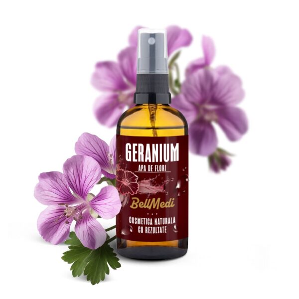 Apa de geraniu este o apă florală (hidrolat) naturală obținută din frunzele proaspete de geraniu parfumat (Pelargonium graveolens). Nu conține conservanți sau substanțe sintetice și este potrivită chiar și pentru piele sensibilă.