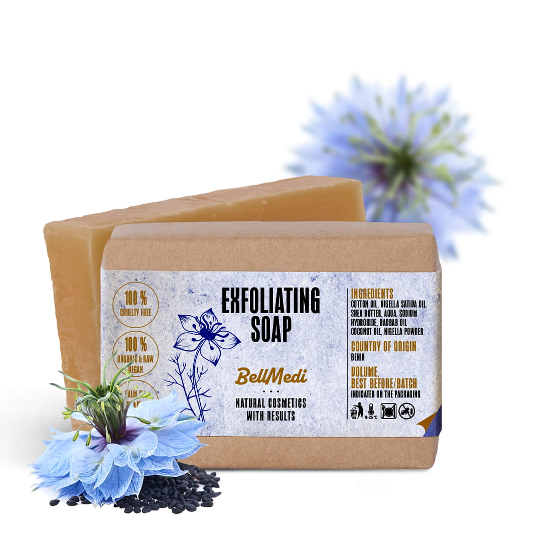 Săpunul exfoliant este un săpun 100% natural cu chimen negru (Nigella sativa), conceput pentru curățarea zilnică a feței, mâinilor și corpului, cu un efect exfoliant delicat. Este potrivit pentru toate tipurile de piele, în special pentru piele mixtă, piele problematică și ternă, predispusă la acnee și pori încărcați.